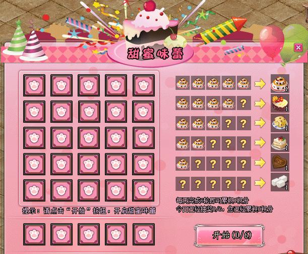 2、每人每天有6次机会寻找[超级蛋糕],每次可以选5个位置, 找到[超级蛋糕]数量越多,奖励越丰厚!每轮参与需要耗不同个数的[甜蜜糖果]。