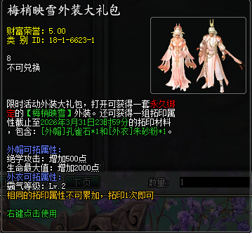 2、选购时装大礼包不仅可以收获永久的限定时装,同时还可获得3个月的强劲拓印属性:霸气等级Lv2、绝学攻击500点、生命最大值2000点。