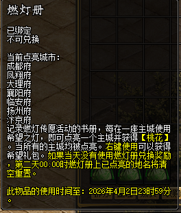 4、每当在一个主城放飞希望之灯,【燃灯册】上将会点亮对应的城市。当7个城市皆被点亮后,右键使用燃灯册将会获得1个【希望礼包】(绑定,有效期为活动结束)。
