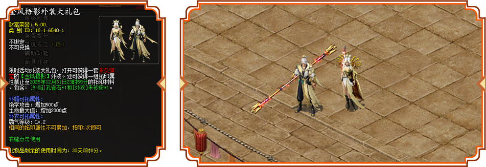 2、现在选购不仅可以收获永久的限定时装,同时还可获得3个月的强劲拓印属性:霸气等级Lv2、绝学攻击500点、生命最大值2000点。