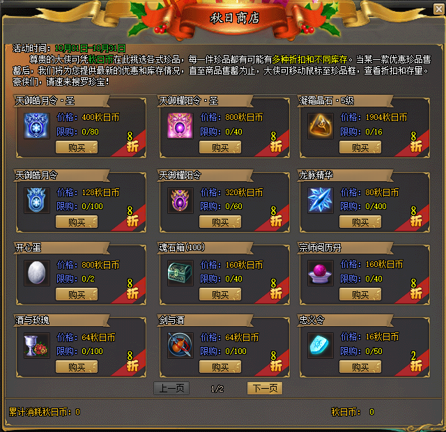 4、活动结束后,未使用的秋日币将直接失效且不可兑换其他道具,因此请各位大侠尽早且合理安排使用哦!