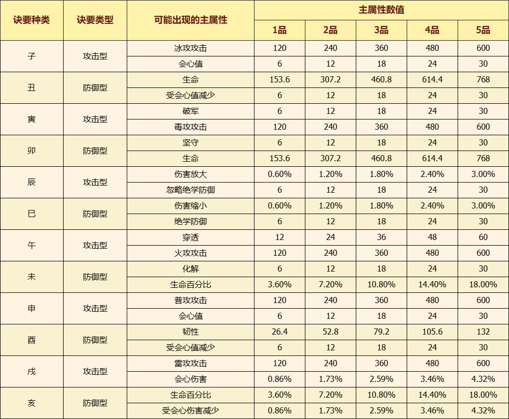 各个种类诀要可能出现的主属性以及主属性数值如下: