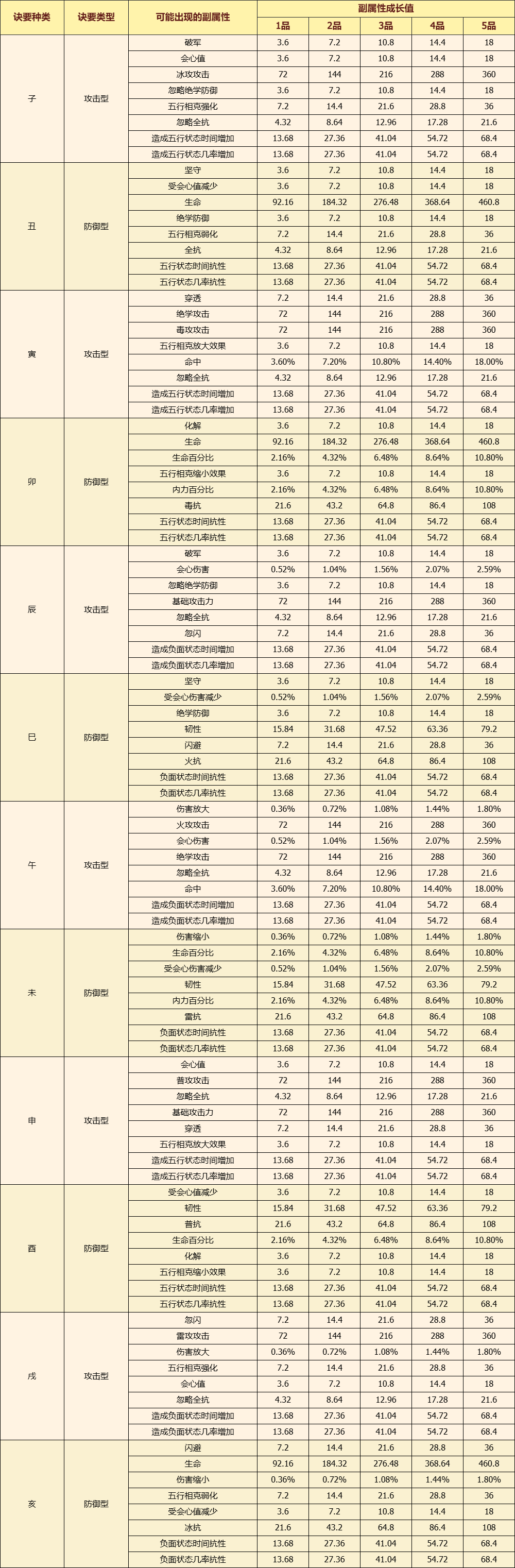 各个种类诀要可能出现的副属性以及单次提升的成长属性如下: